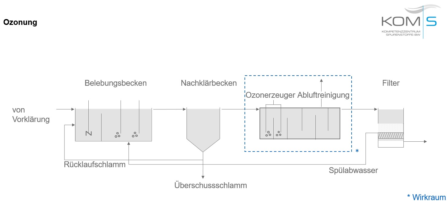 Ozon reagiert nicht nur mit den zu eliminierenden Spurenstoffen sondern auch mit anderen Abwasserinhaltsstoffen wie bspw. dem DOC, Feststoffen oder Nitrit. Um den Ozonverbrauch zu minimieren, empfiehlt sich ein Einsatz der Ozonung daher nach der biologischen Reinigungsstufe. Für die technische Umsetzung einer Ozonung in kommunalen Kläranlagen bedarf es folgender Komponenten: