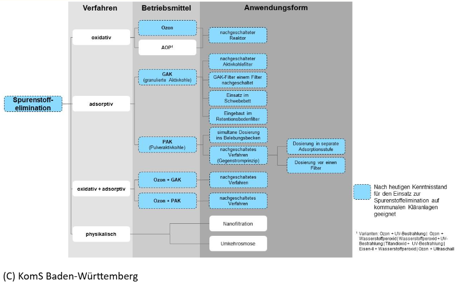 Zur Elimination von Spurenstoffen aus dem Abwasser kommen unterschiedliche Verfahrenstechniken in Frage. Welche Verfahren und welche Anwendungsformen einer für den Ausbau einer Kläranlage geeignet sind, muss im Einzelfall erörtert werden. Für die Auswahl ist neben der Eliminationsleistung die technische Realisierbarkeit unter Berücksichtigung von ökonomischen und ökologischen Aspekten mit in Betracht zu ziehen. Hinweise zur Verfahrensauswahl können dem Leitfaden „Machbarkeitsstudien zur Spurenstoffelimination auf kommunalen Kläranlagen“ entnommen werden.